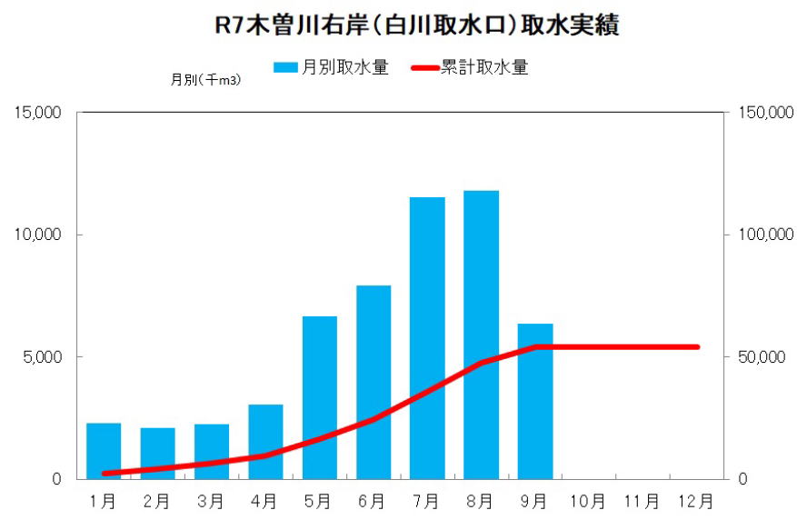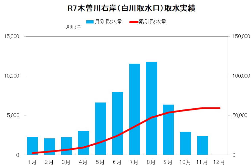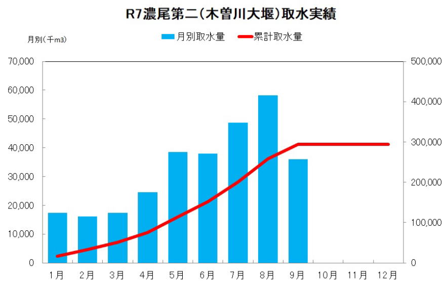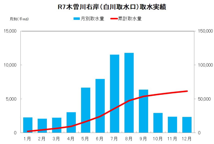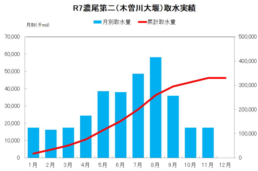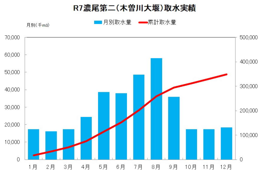 平成23年の1月から12月までの木曽川用水の馬飼取水口 の取水量は359,702,000m3ですが、