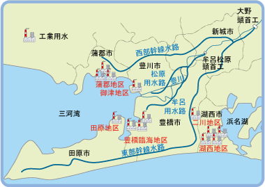 豊川用水の水は、愛知県企業庁の豊橋南部と蒲郡、静岡県企業局の湖西市梅田の三つの浄水場へ送られ、ろ過してきれいになった水を、豊橋南部浄水場からは、豊橋臨海、田原、二川地区、蒲郡浄水場からは蒲郡と御津地区、梅田浄水場からは、湖西地区の各工場へ供給しています。