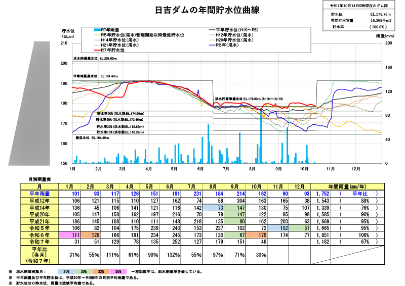 10/16日0時付で平常時最高貯水位(常時満水位)へ移行し、貯水率の基準がEL.191.40mに変わります。