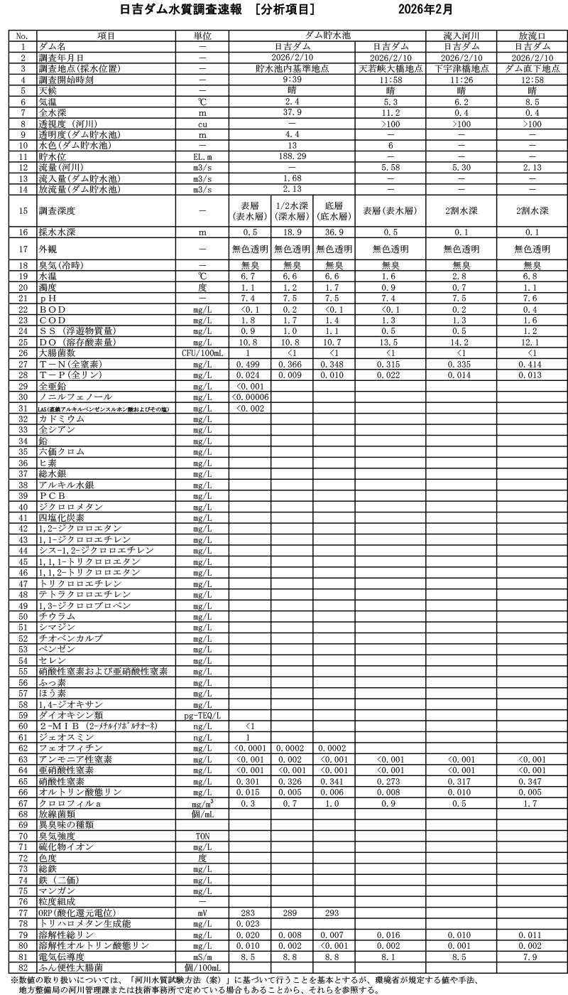 日吉ダム周辺で実施した水質測定の結果です。(毎月1回更新,今年度分は速報値)