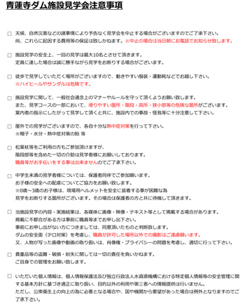 青蓮寺ダム施設見学会を7月26日、8月2日、9日、16日、23日、27日に行います。