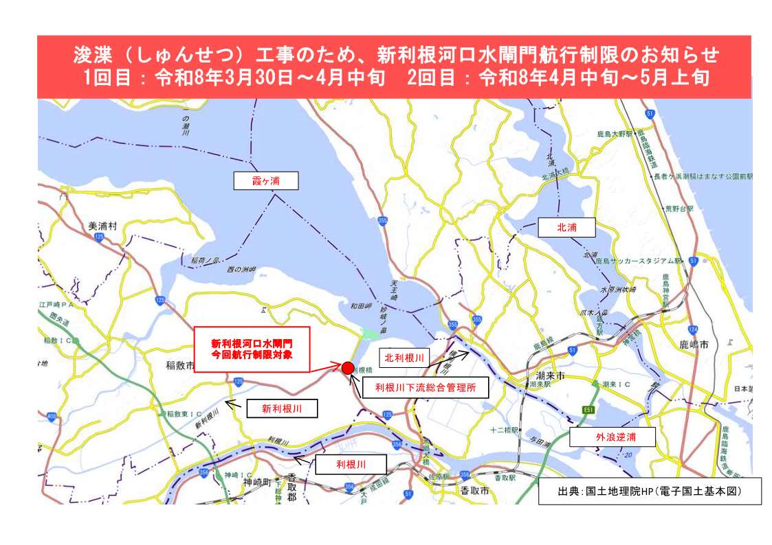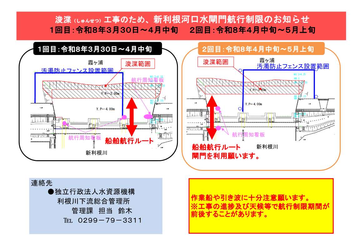 現在、新利根河口水門の通航は可能となっていますが、霞ヶ浦での浚渫工事のため、令和8年3月30日夕刻より、一部の水門等を閉鎖します。最新の航行情報を確認いただき通航をお願いします。なお、3月30日より4月中旬までの期間は、東側(管理所側)の水門の通航が可能となってます。
