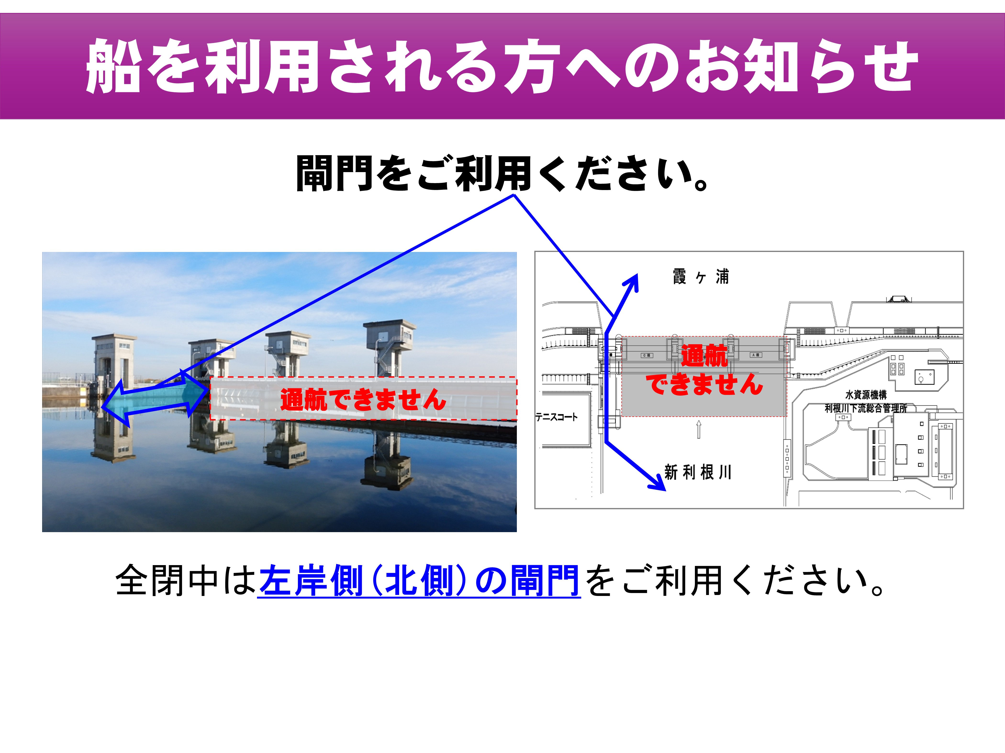 黒部川閘門 黒部川~利根川 12.0 4.0 2.1 1.5 0:00~24:00 立入禁止区域等の詳細はこちら(利根川河口堰HP)