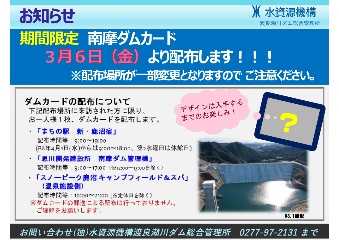 配布場所:・渡良瀬川ダム総合管理所 思川開発建設所 南摩ダム管理棟